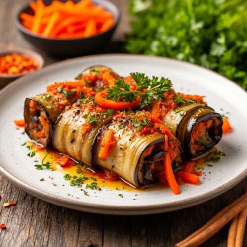 РУЛЕТИКИ ИЗ БАКЛАЖАНА С ОСТРОЙ МОРКОВКОЙ