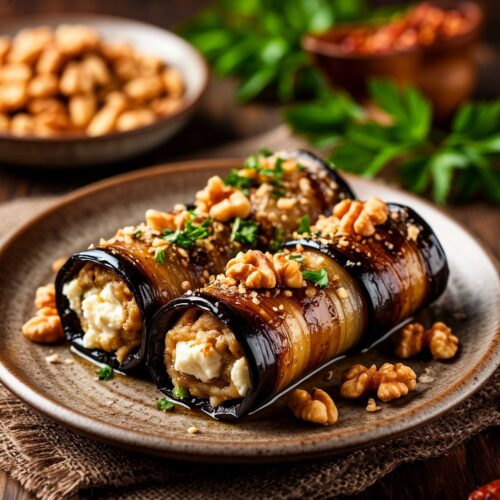 РУЛЕТИКИ ИЗ БАКЛАЖАНА С КАВКАЗСКИМ СЫРОМ И ОРЕХОМ