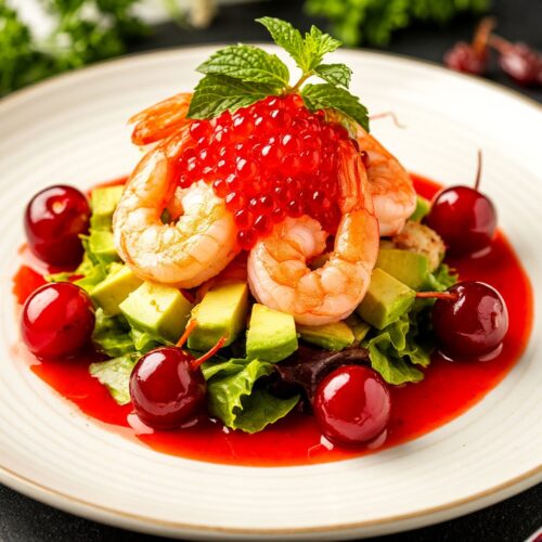 САЛАТ ИЗ КРЕВЕТОК С ЧЕРРИ И СОУСОМ ИЗ КРАСНОЙ ИКРЫ