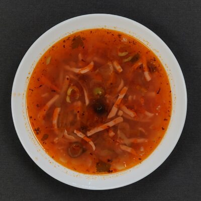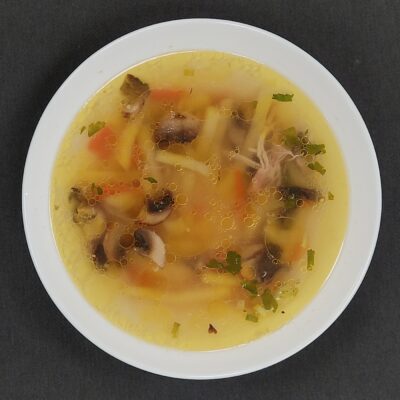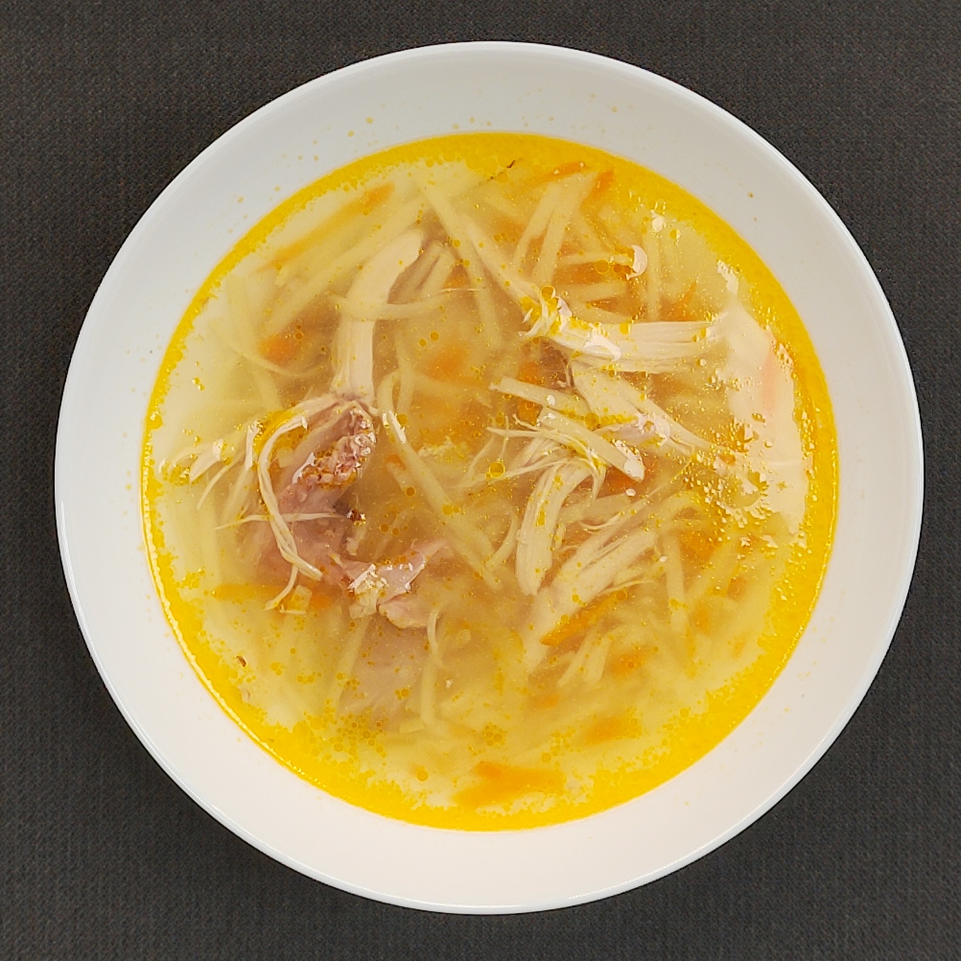 Состав: цыплёнок, лапша яичная, морковь, лук репчатый, бульон куриный