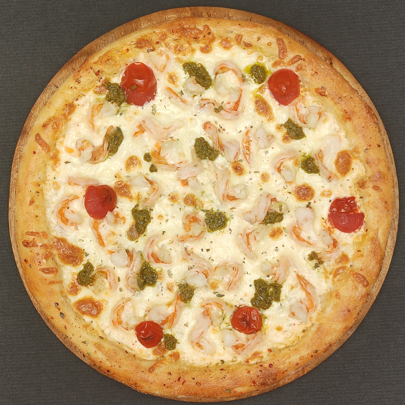 Состав: фирменный белый соус, соус песто, креветки, черри, сыр моцарелла