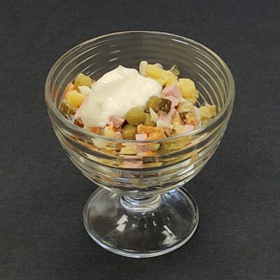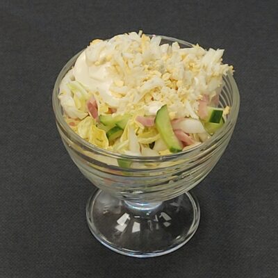 Состав: ветчина, капуста пекинская, огурец, болгарский перец, оливки/маслины, сыр, соус “Цезарь”