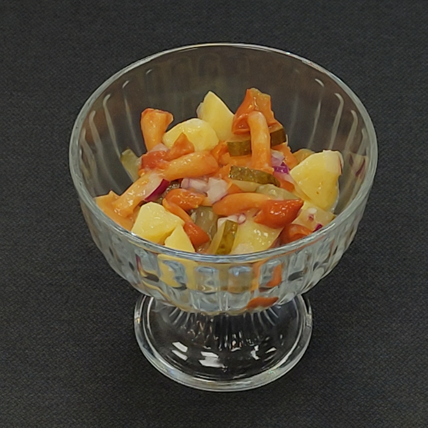 Состав: картофель, грибы маринованные, огурец маринованный, лук репчатый красный, масло растительное