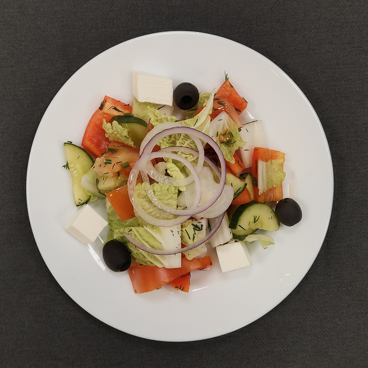 Состав: огурец, помидор, болгарский перец, сыр фета, маслины, лук красный, заправка на основе оливкового масла