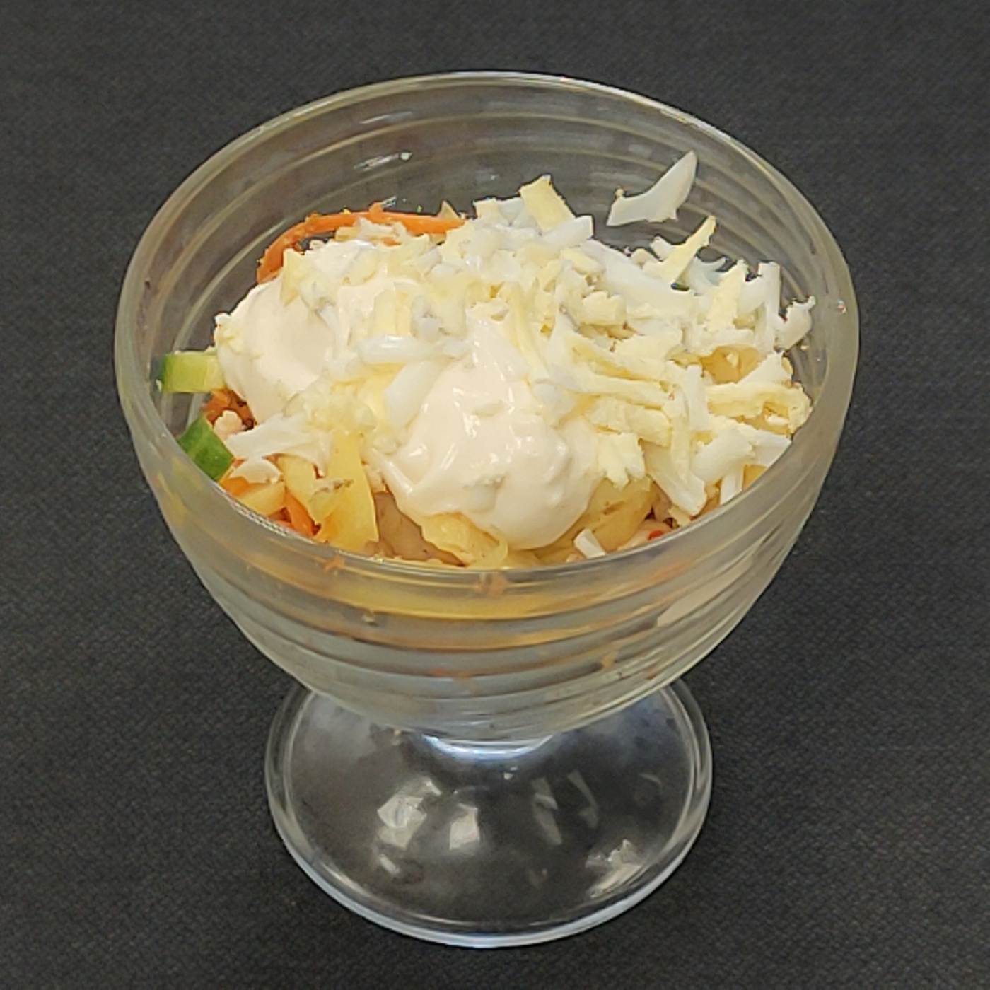 Состав: филе курицы(грудка), картофель, огурец, морковь по-корейски, яйцо, зелень, майонез