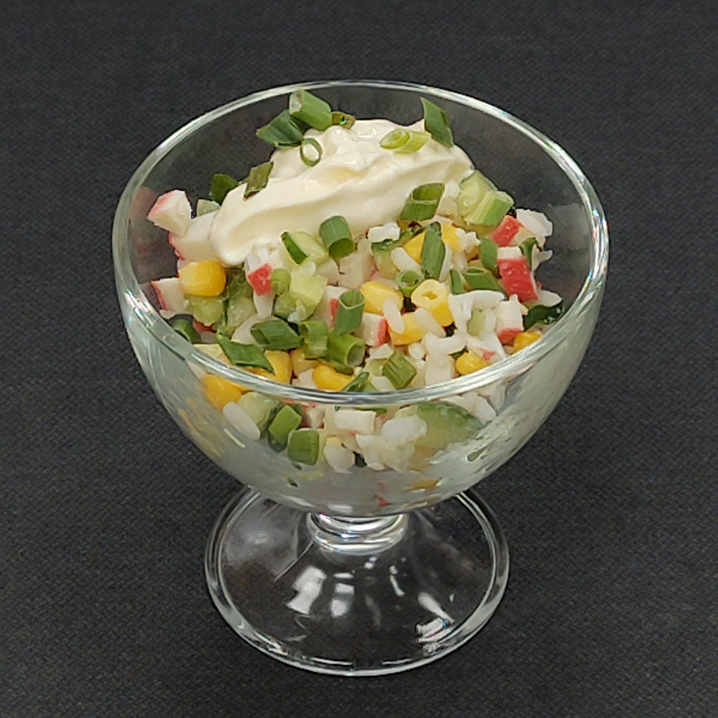 Состав: рис, крабовые палочки, яйцо, кукуруза консервированная, огурец, зелень, майонез