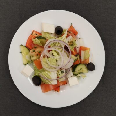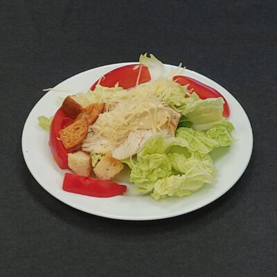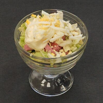 Состав: ветчина, капуста пекинская, огурец, кукуруза, морковь по-корейски, гренки, майонез