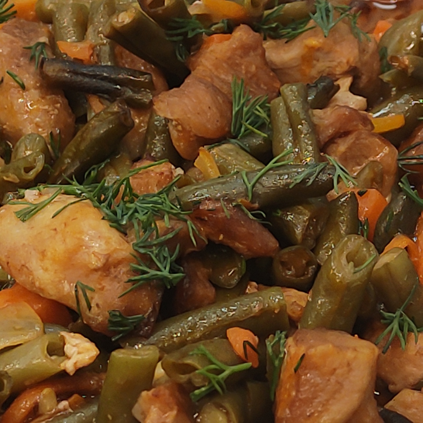 Состав: свинина, фасоль стручковая, лук репчатый, морковь, томатная паста, специи