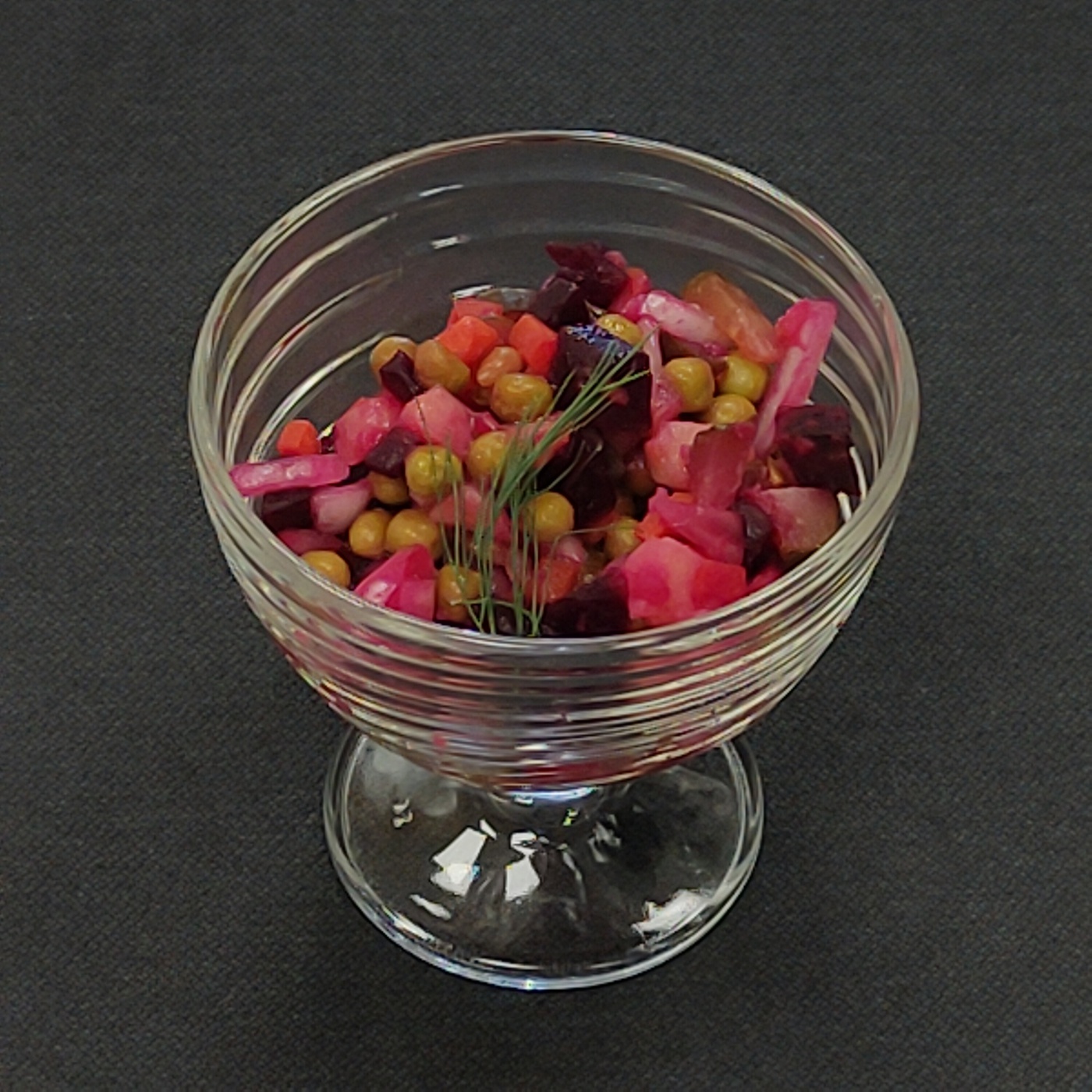 Состав: свекла, морковь, картофель, солёные огурцы, зелёный горошек, лук